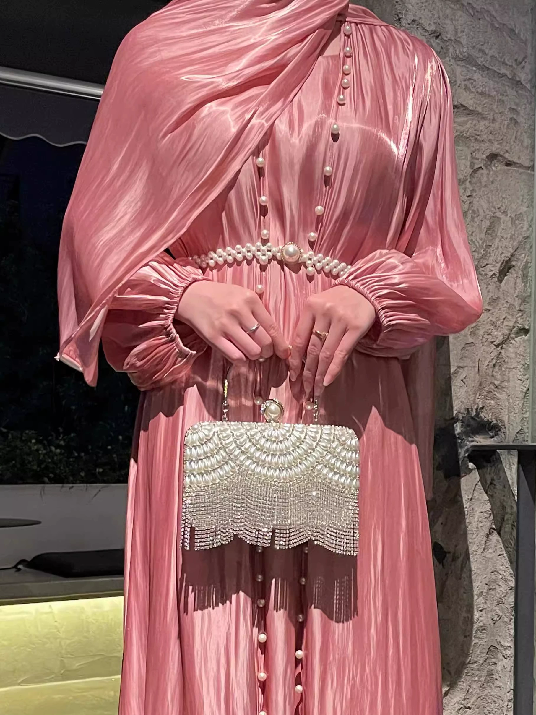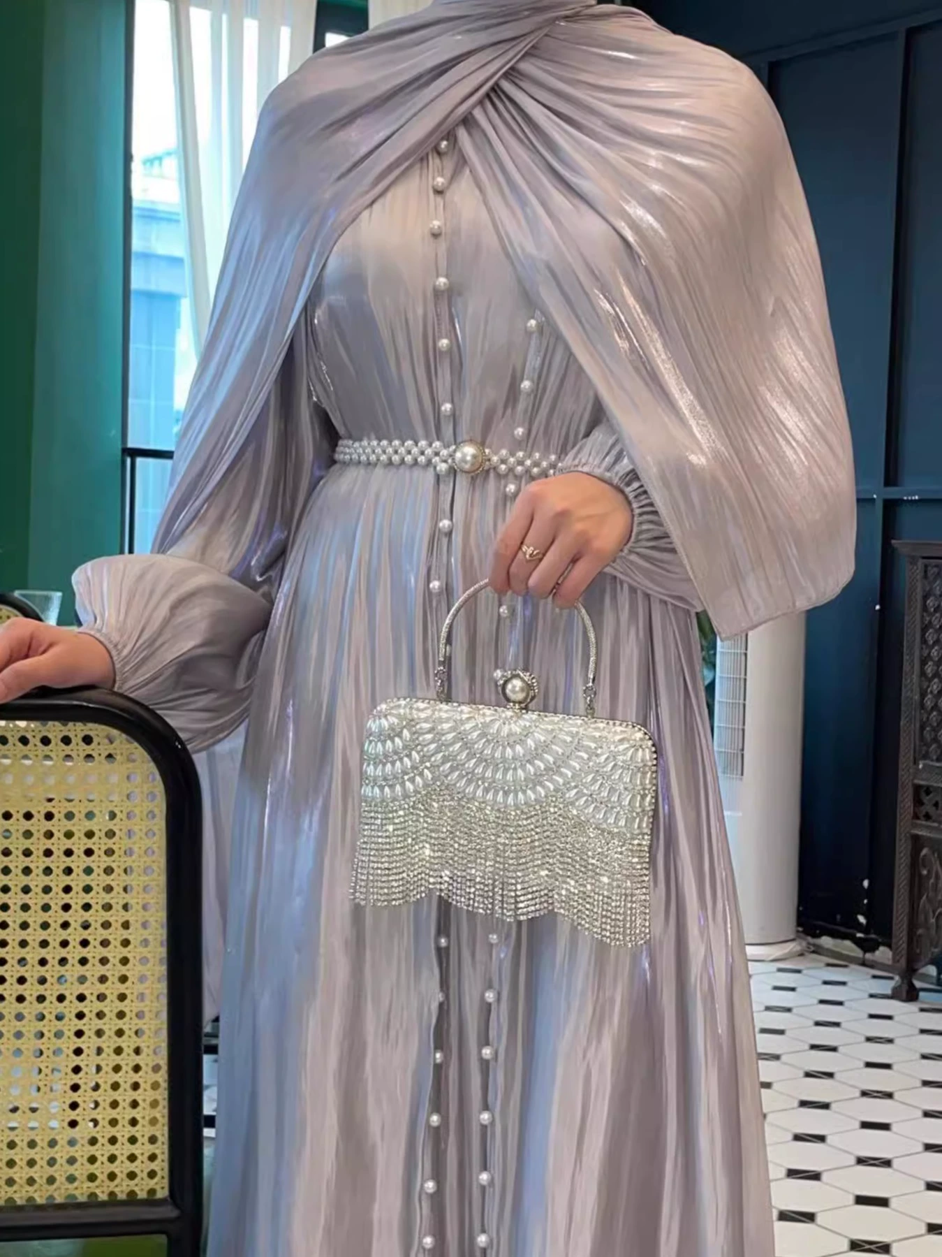 Middle eastern export dubai evening dress, featuring a flowing tulle inner skirt, outer skirt, and hijab t