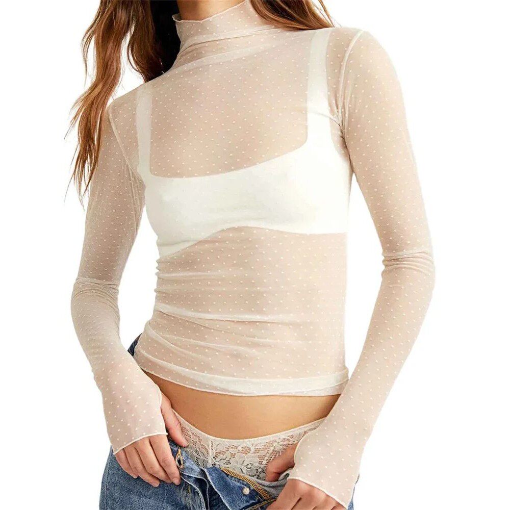Women Mesh Dot T-shirt Long Sleeve Turtleneck Slim Fit Tee o