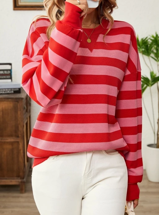 Women's Fashion City Pullover 2025 Autumn Winter Latest Casual Top Two Tone Striped Round Neck Long Sleeved Loose Sweatshirt